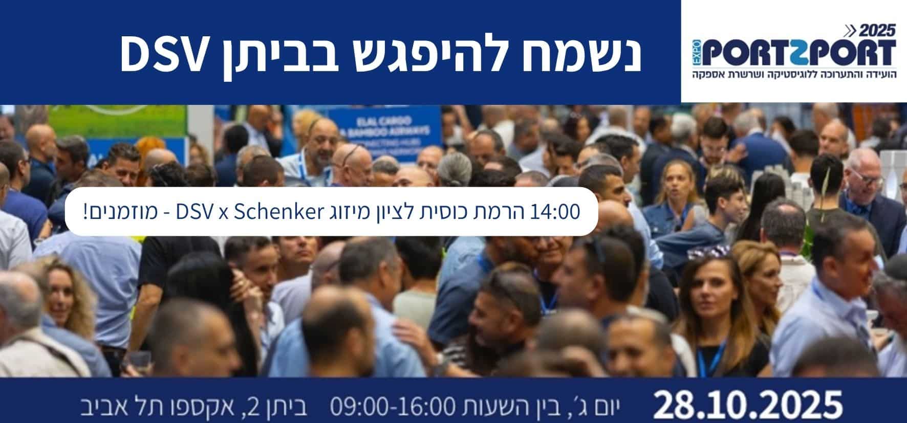 מחכים לפגוש אתכם במתחם DSV בתערוכת PORT2PORT, התערוכה השנתית לתובלה, שילוח ושרשרת האספקה. במתחם DSV בתערוכה, שעוצב השנה בסימן המיזוג עם חברת Schenker והפיכת DSV לחברת השילוח הגדולה בעולם, נציג ממגוון השירותים והפתרונות החדשניים שאנחנו מציעים ללקוחותינו: הדגמות אונליין של myDSV – הפלטפורמה הדיגיטלית שמאפשרת ללקוחותינו ליהנות מכל יתרונות מערכת DSV הגלובלית ישירות למחשב או הנייד שלהם – שקיפות מלאה 24/7 על כל משלוח, בכל מקום בעולם. Contract Logistics – מערך המרלוגים והלוגיסטיקה של DSV שממשיך להתרחב עם השקת המרלוג הדרומי החדש בפארק יואב. DSV E-Commerce – מסוף רובוטי חדשני למשלוחי איקומרס של ענקית הסחר האלקטרוני AliExpress ואתרי מכירות אחרים. פנל – פורום נשים בלוגיסטיקה שהוקם על ידי DSV מתוך מודעות לצורך בייצוג נשי משמעותי יותר בקדמת הבמה המקצועית של תחום הלוגיסטיקה, ובכלל. כמו כן, סיגל מנהיים קצוביץ, מנכ"לית DSV ישראל תתארח בפאנל "בין טראמפ לסין – סדר עולמי חדש" שיערך באולם המליאה של הועידה בשעה 12:20. ולסיום (שהוא רק ההתחלה!) נשמח שתצטרפו אלינו להרמת כוסית בשעה 14:00– לרגל המיזוג עם Schenker במתחם שלנו בתערוכה, בשעה 14:00