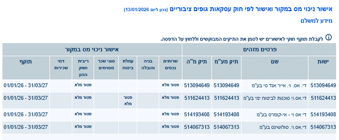 תוקף אישורי ניכוי מס במקור וניהול ספרים עבור כל חברות הקבוצה הוארך עד ליום 31/03/2027. מצ"ב קישור לאתר רשות המיסים לצורך הפקת האישורים המעודכנים: |
