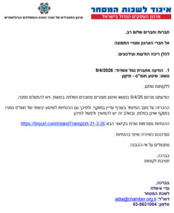 Following is an update received last night – Thursday, April 9, 2026 – from the Federation of Israeli Chambers of Commerce, stating that the guidelines for the land transport of hazardous materials remain in effect and have not been canceled, contrary to the announcement published earlier yesterday.