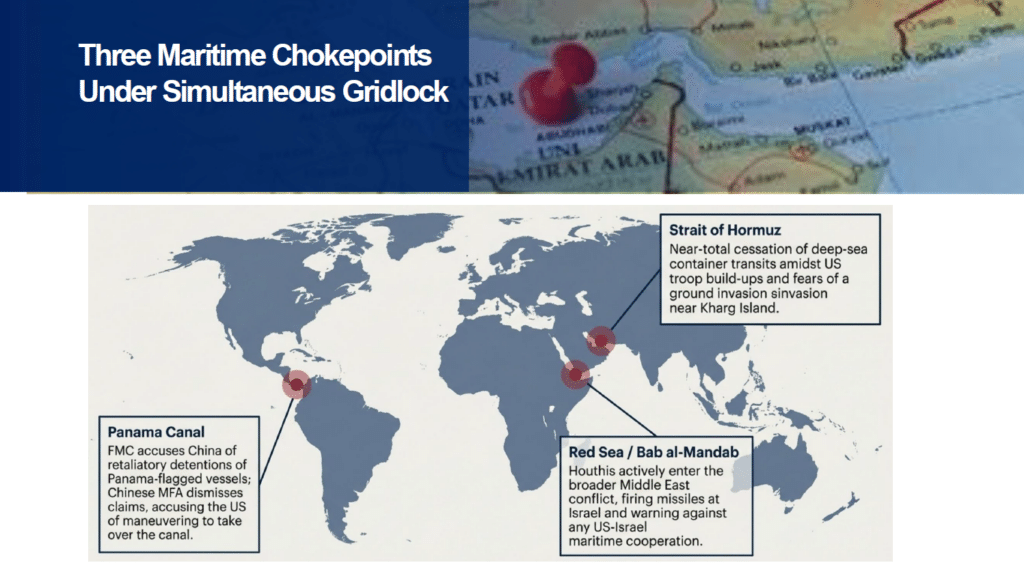 The current increases in transport costs are not driven by traditional supply-and-demand dynamics, but by fuel-specific disruptions across three major corridors: Hormuz, the Red Sea, and now emerging constraints around Panama. This means that even if freight demand softens, rates can continue rising because the primary cost driver is fuel, not volume.